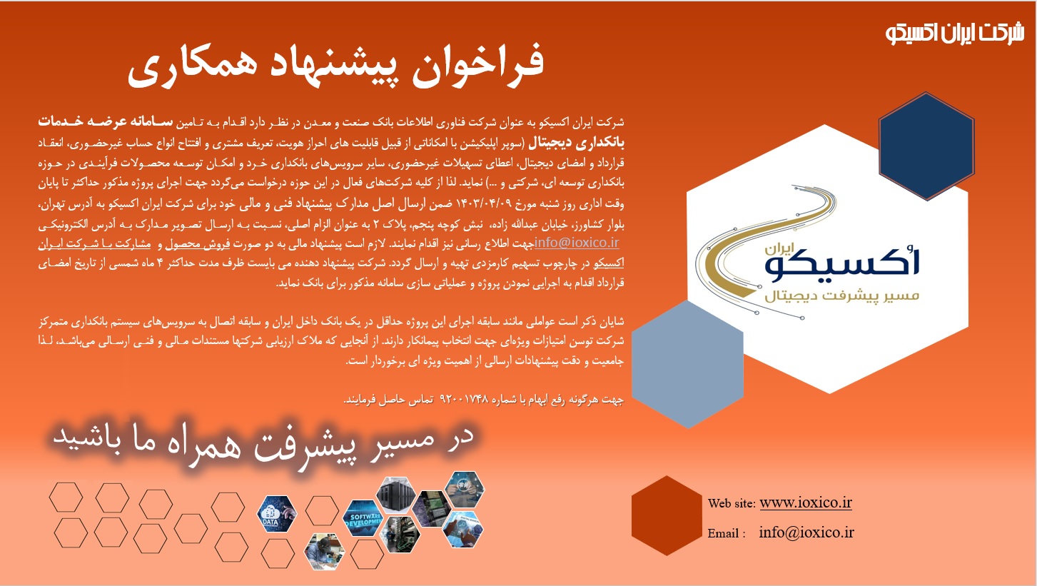 در راستای انجام وظایف و تکالیف شرکت اکسیکو به عنوان بازوی اجرایی بانک صنعت و معدن، شرکت در نظر دارد اقدام به تامین سامانه عرضه خدمات دیجیتال بانک نمايد. لذا از متقاضیان دعوت میشود پیشنهادات همکاری خود را مطابق با آگهی منتشره ظرف مدت مقرر به دفتر شرکت ارسال نمايند.